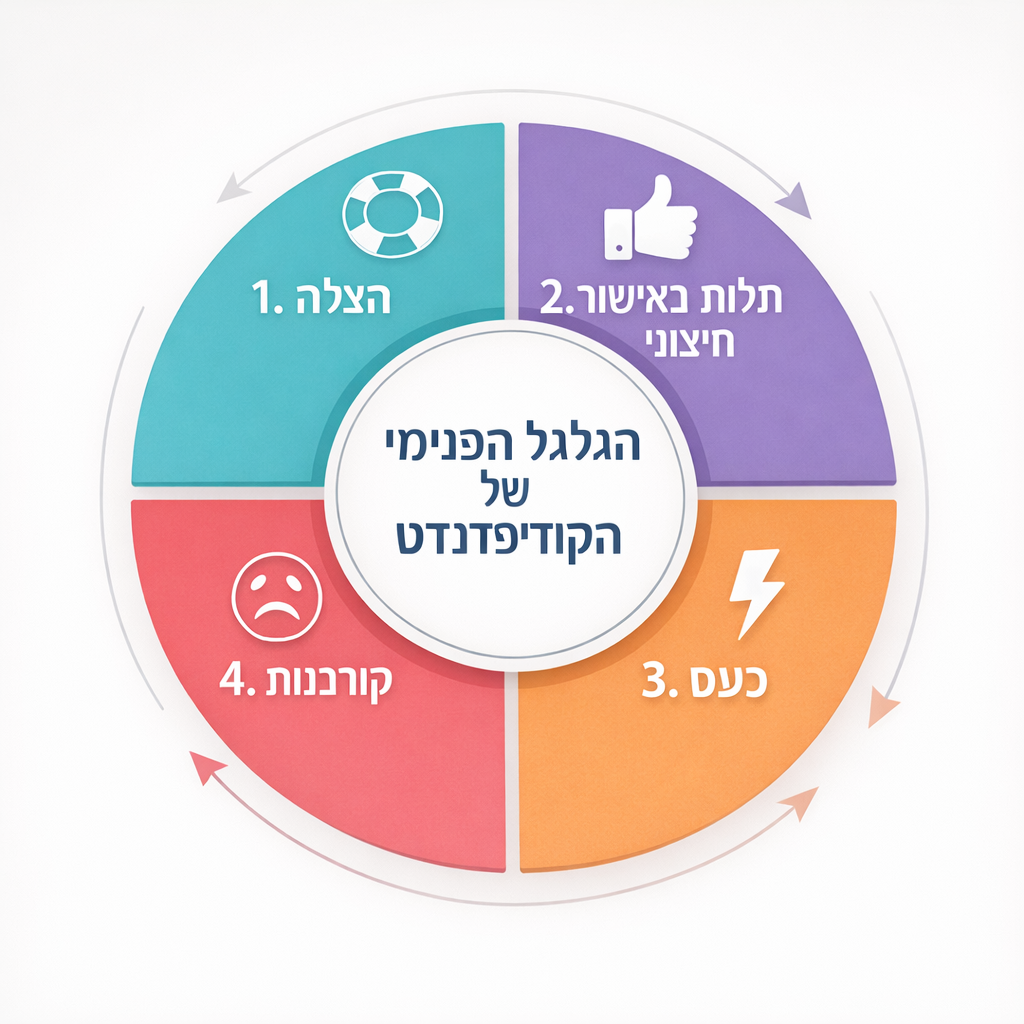איך זה נמשך - מעגל הקסמים הזה? בחיזוק שאנחנו מקבלים מההצלה של כל העולם לצורך שלנו באישור לזכות שלנו להיות. להיות ראויים להתקיים. פה קבור הכלב, או האישו הפנימי המהותי של קו-דיפנדנט - תחושת ה"אני לא מספיק". וכשאנחנו מקדישים את עצמנו להצלה של אחרים, זה מאפשר לנו להרגיש כן ראויים במידת מה להתקיים והופך אותנו לתלויים בצורך הזה שיצטרכו אותנו.